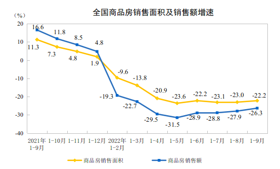 1—9月份,商品房銷售面積101422萬平方米,同比下降22.2%,其中住宅銷售面積下降25.7%。商品房銷售額99380億元,下降26.3%,其中住宅銷售額下降28.6%。