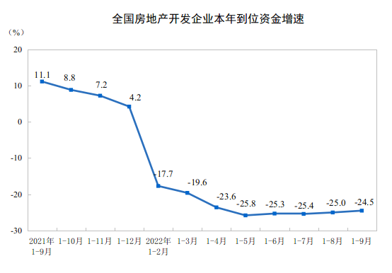 1—9月份,房地產開發企業到位資金114298億元,同比下降24.5%。其中,國內貸款13661億元,下降27.2%;利用外資61億元,增長2.7%;自籌資金40568億元,下降14.1%;定金及預收款37348億元,下降34.1%;個人按揭貸款18397億元,下降23.7%。