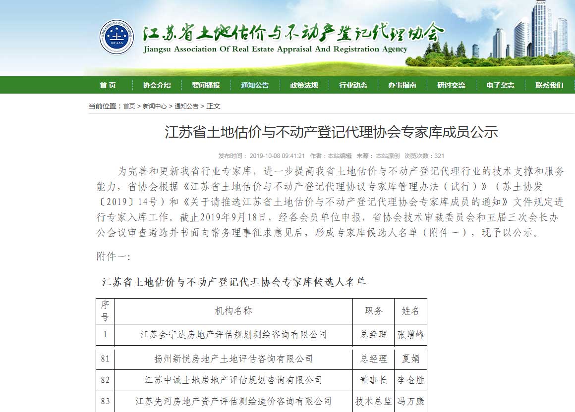 為完善和更新省行業專家庫,省協會根據《江蘇省土地估價與不動產登記代理協議專家庫管理辦法(試行)》(蘇土協發〔2019〕14號)和《關于請推選江蘇省土地估價與不動產登記代理協會專家庫成員的通知》文件規定進行專家入庫工作。我公司董事長李金勝入選江蘇省土地估價與不動產登記代理協會專家庫成員。